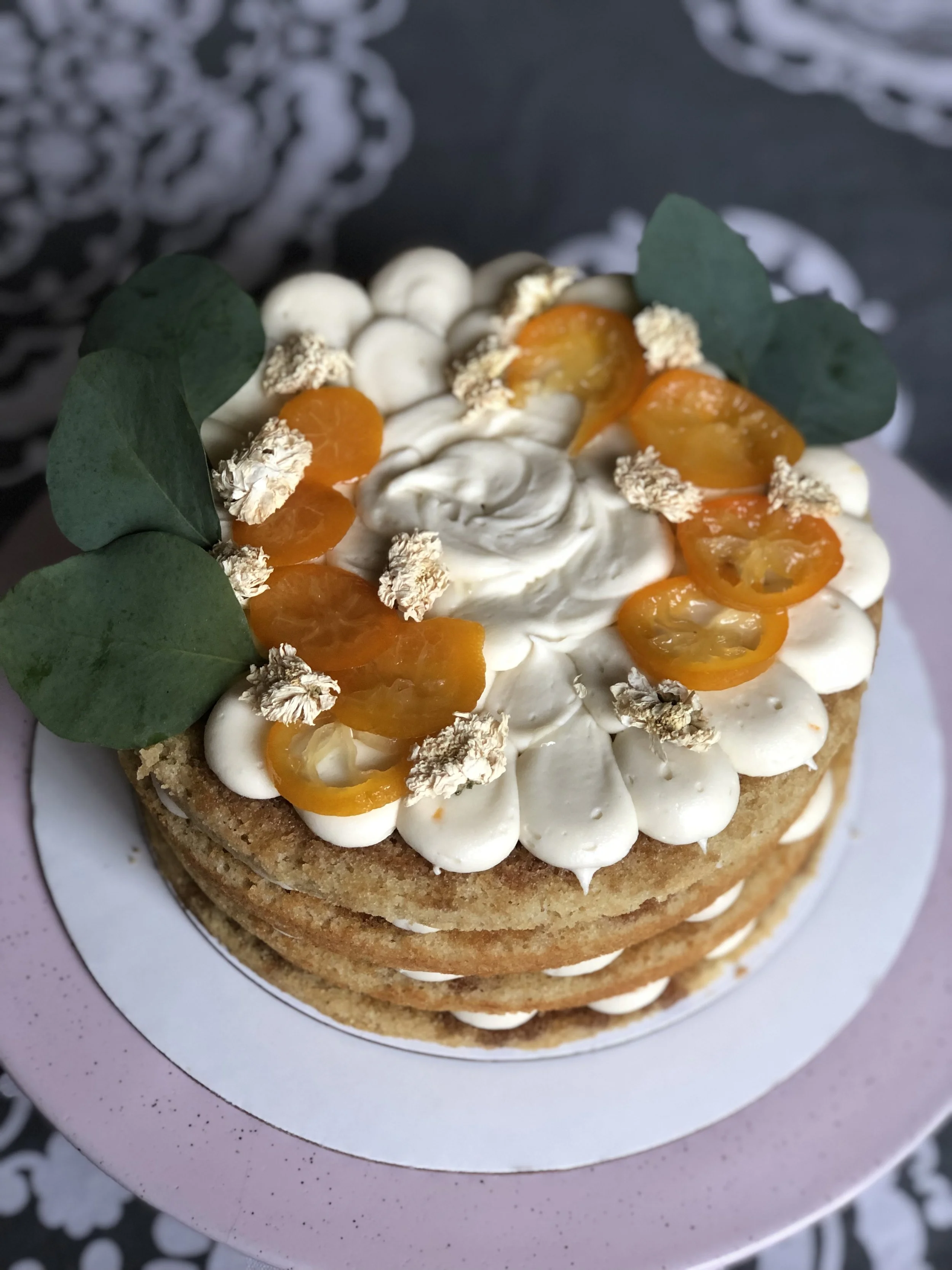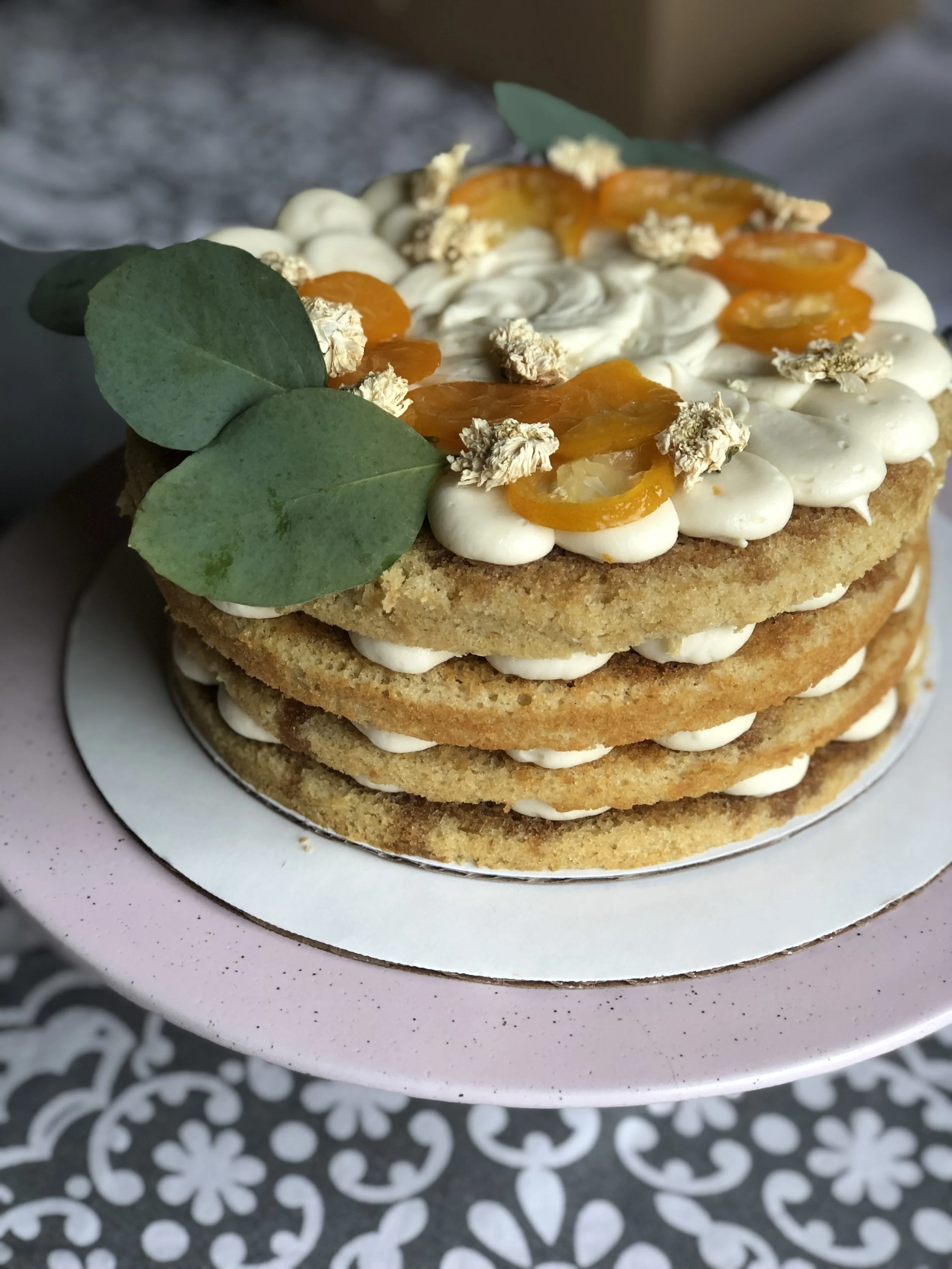 Layers of vanilla earl grey cake. Filled with an orange compote and lightly sweetened citrus vegan whipped cream. This cake is light fluffy and perfect for any occasion.
