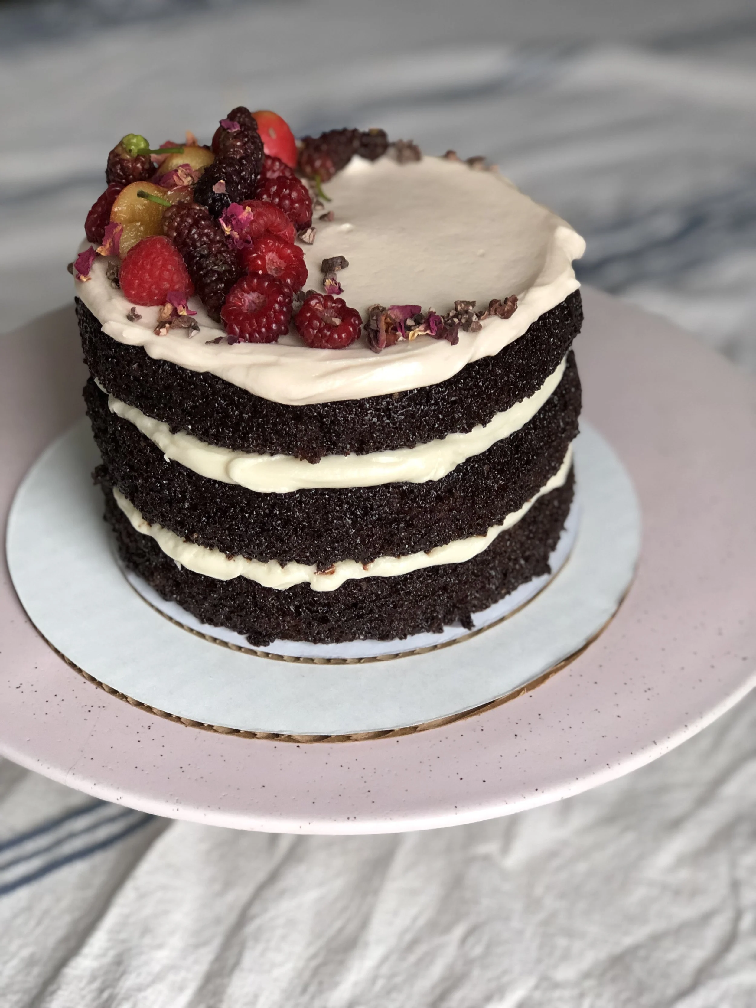 Layers of fluffy rich chocolate cake, fosted with a light peanut butter mousse style frosting inside and out, topped with a rich ganache and cocoa nibs.